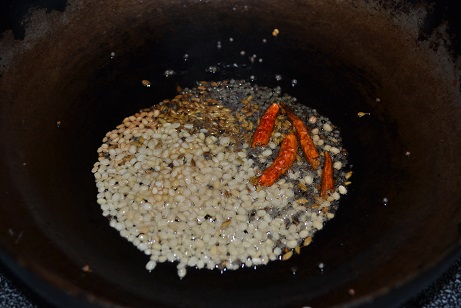 - Add oil and when it becomes hot, add the mustard, cumin, urad dal and dry chilies