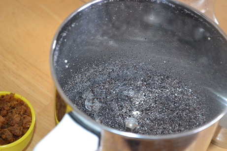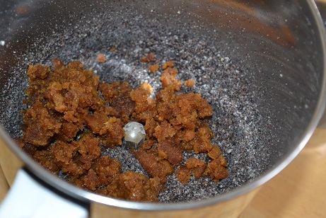 - Add the crushed palm sugar to it and grind it into a fine mixture