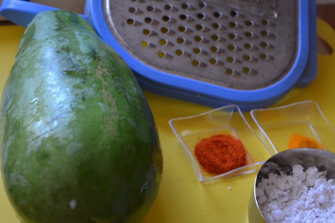 Every house in our hometown has at least one papaya tree in the backyard. Most of the times, we eat them after the fruits are ripe, but when we don’t have any vegetables to make a side dish for rice, the raw papayas come in handy to make a poriyal. When I went to the Indian grocery store, I saw raw papayas and bought one to make poriyal, so today I am writing this recipe for making it.