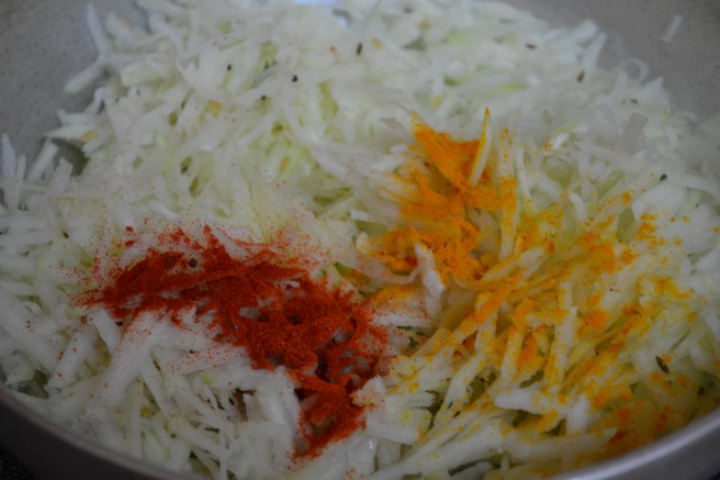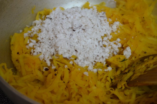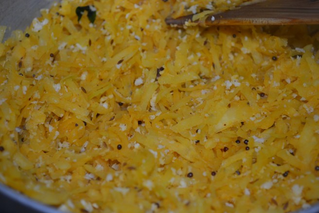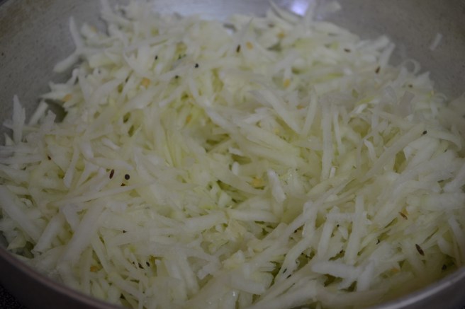 - Once mustard seeds crackle, add the urad dal, cumin seeds and curry leaf