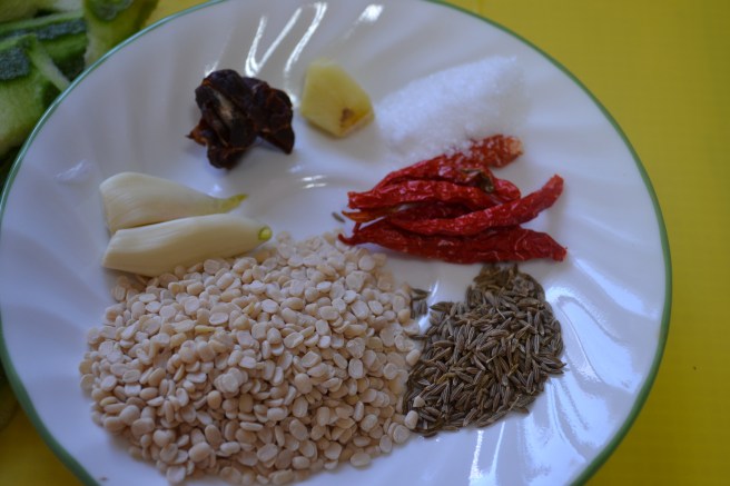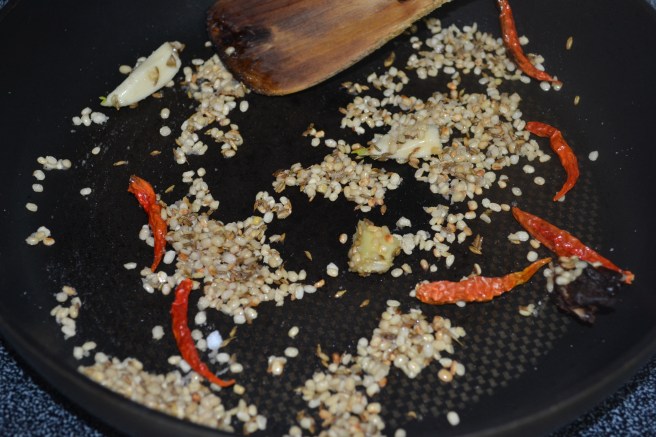 - Add oil, urad dal, dry chilies, garlic cloves, ginger, tamarind and cumin seeds