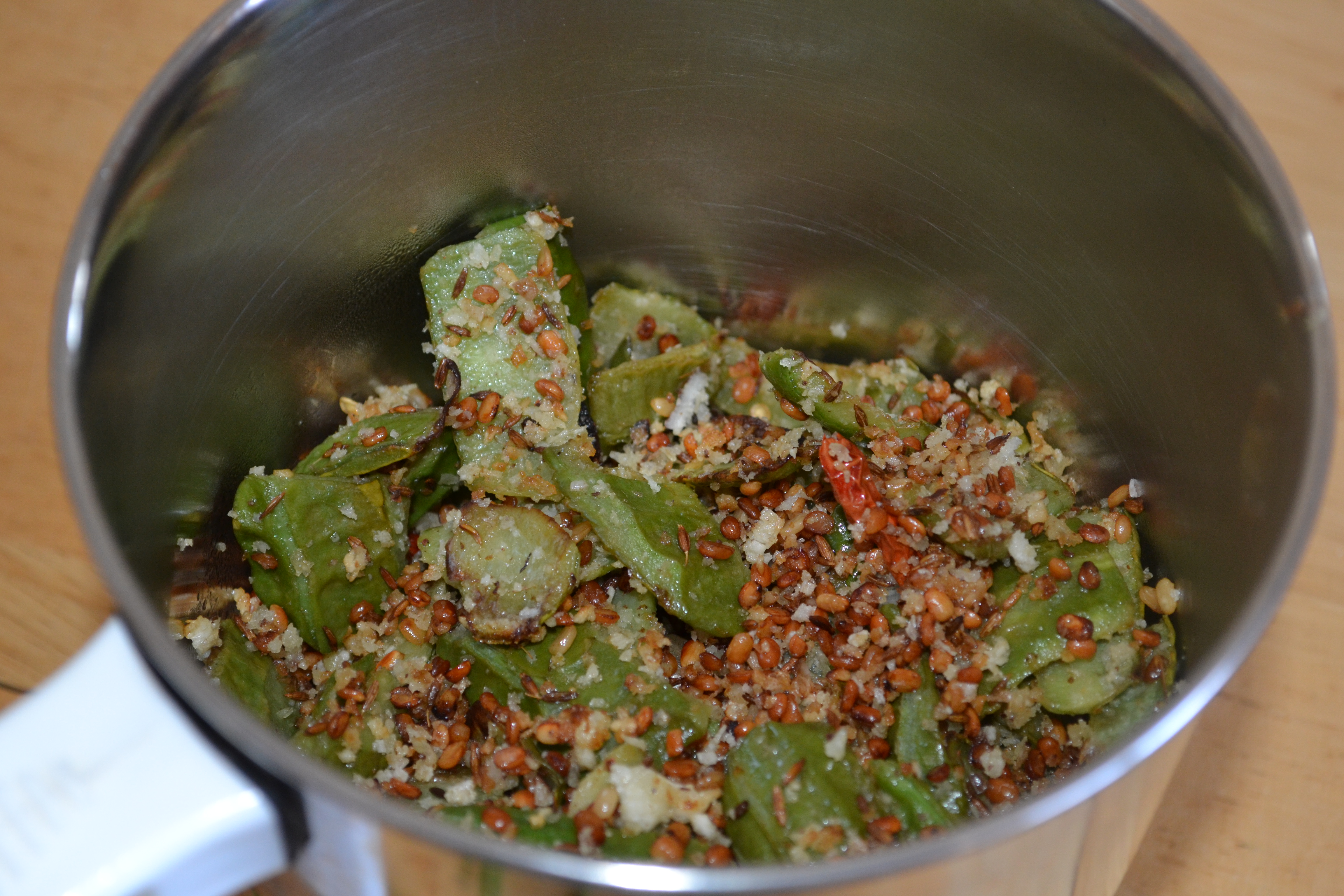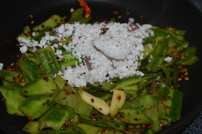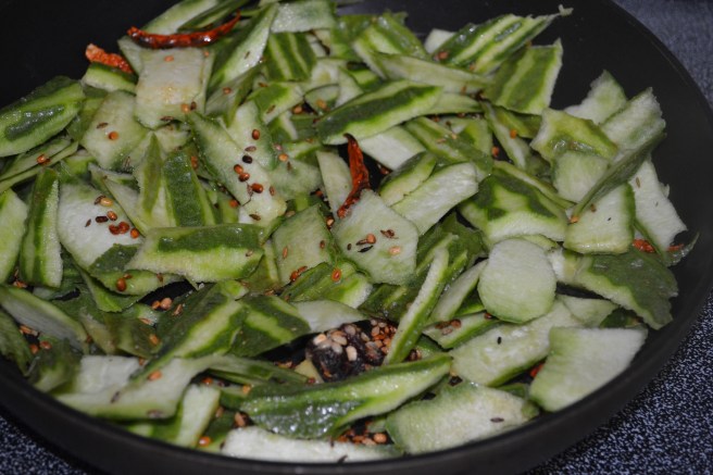 - Once the urad dal turns light brown, add the peerkankai skin and saute for 5 minutes