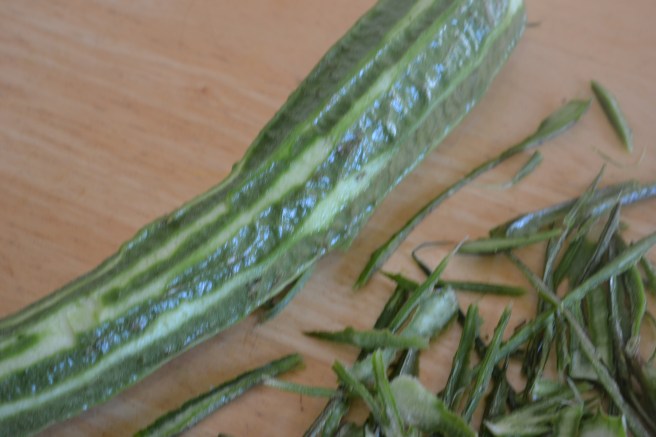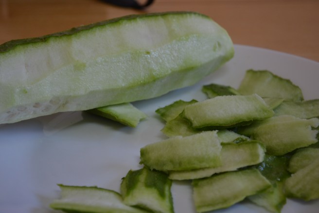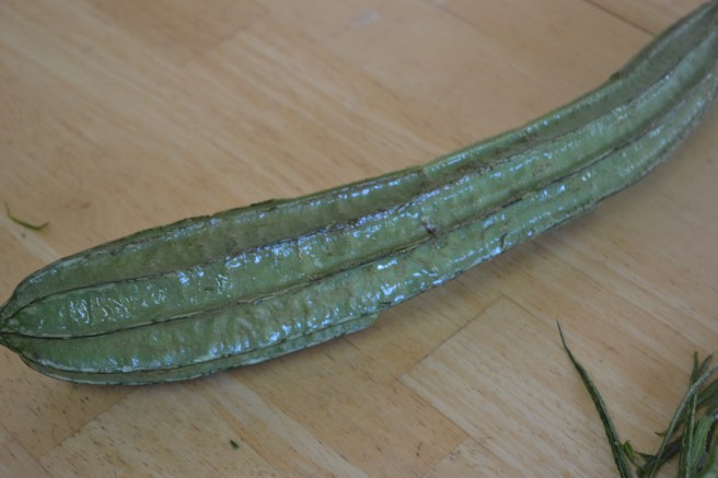 This is a vegetable that I’ve never seen in my hometown in India. But, when we moved to Chennai, the vegetable shops had this particular vegetable – peerkankai – that I found to be particularly strange. Since I always like to try to cook different things, I really wanted to find out what it tasted like. One time, my neighbor said, she made peerkankai chutney for idly. She told me how to use the peerkankai, which I still remember. I asked her a lot of questions about how to cook the vegetable, as well as which parts of the vegetable to use. Hopefully, the pictures below are helpful for the first-time users of peerkankai.