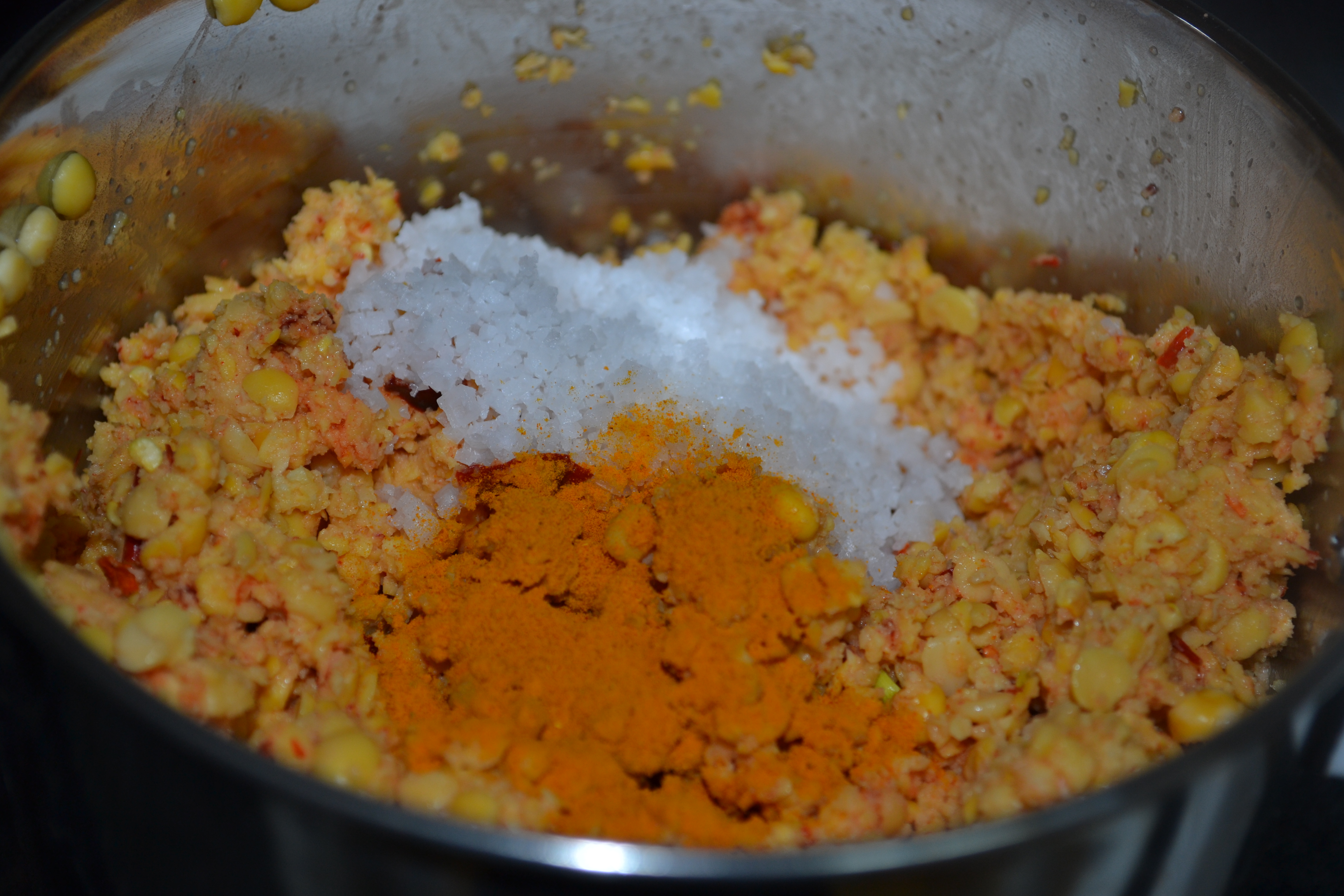 - While grinding, add the garlic cloves, salt, asafoetida and turmeric powder