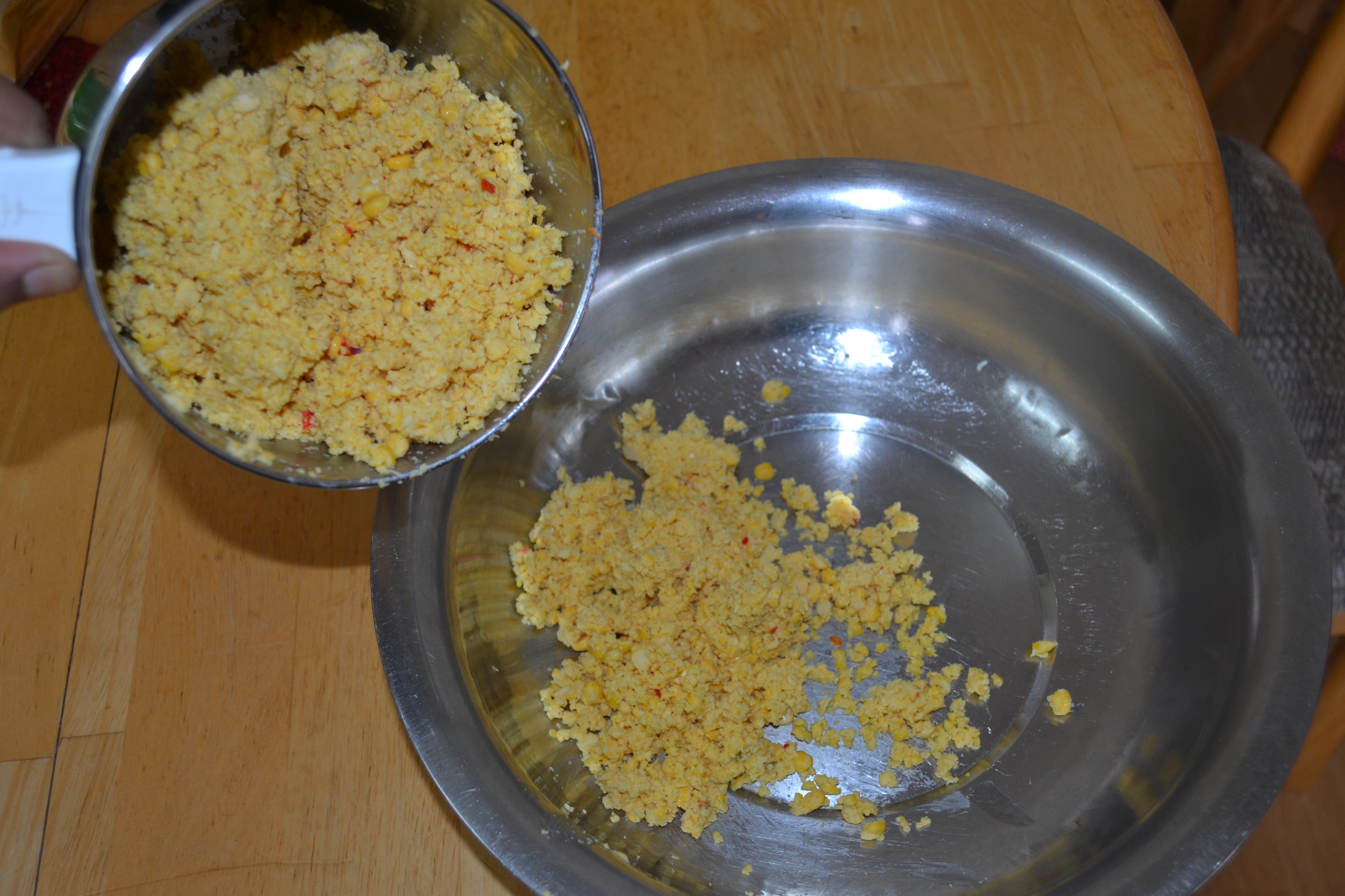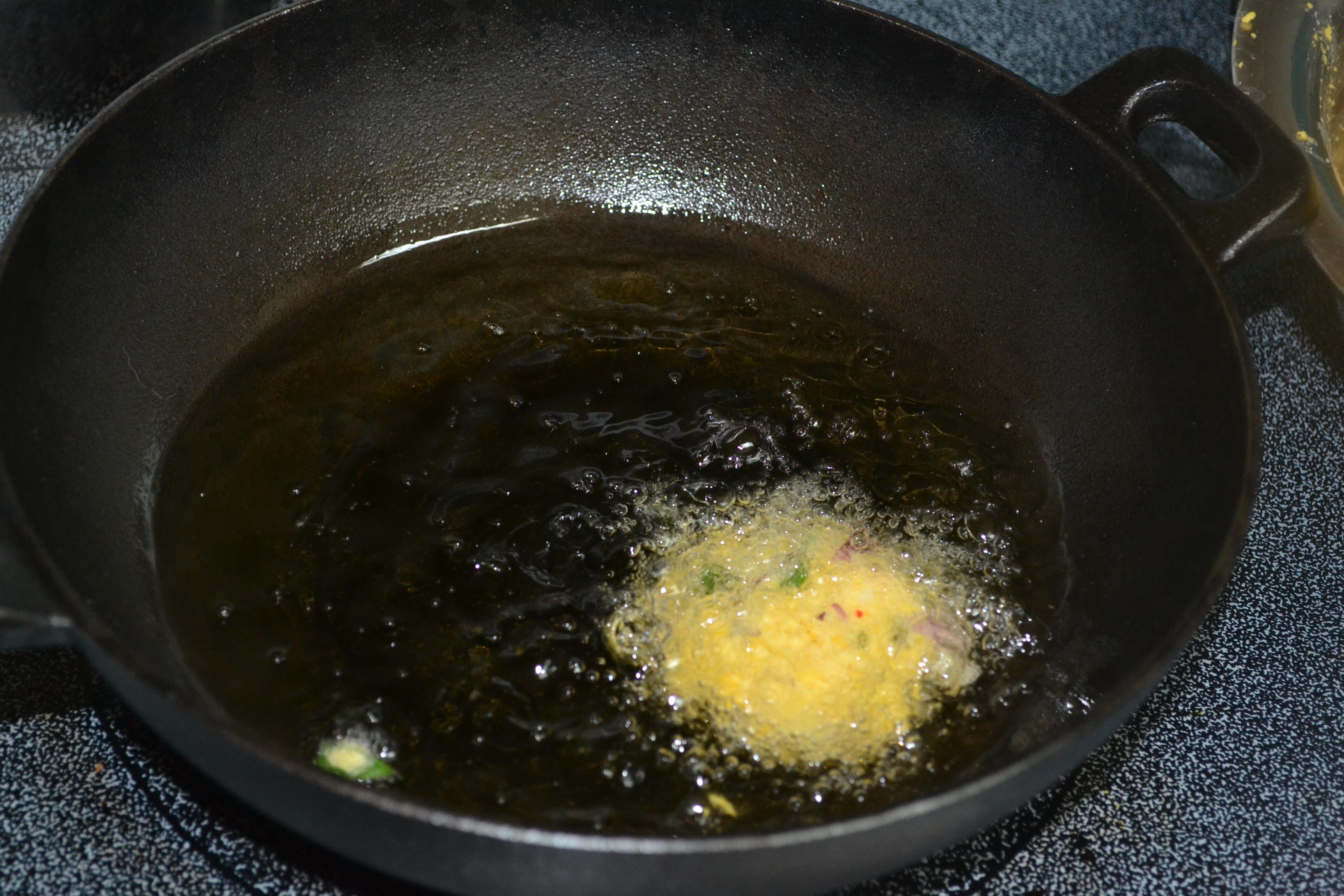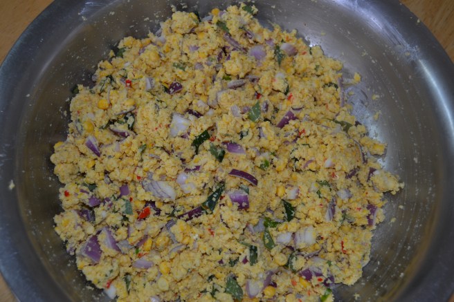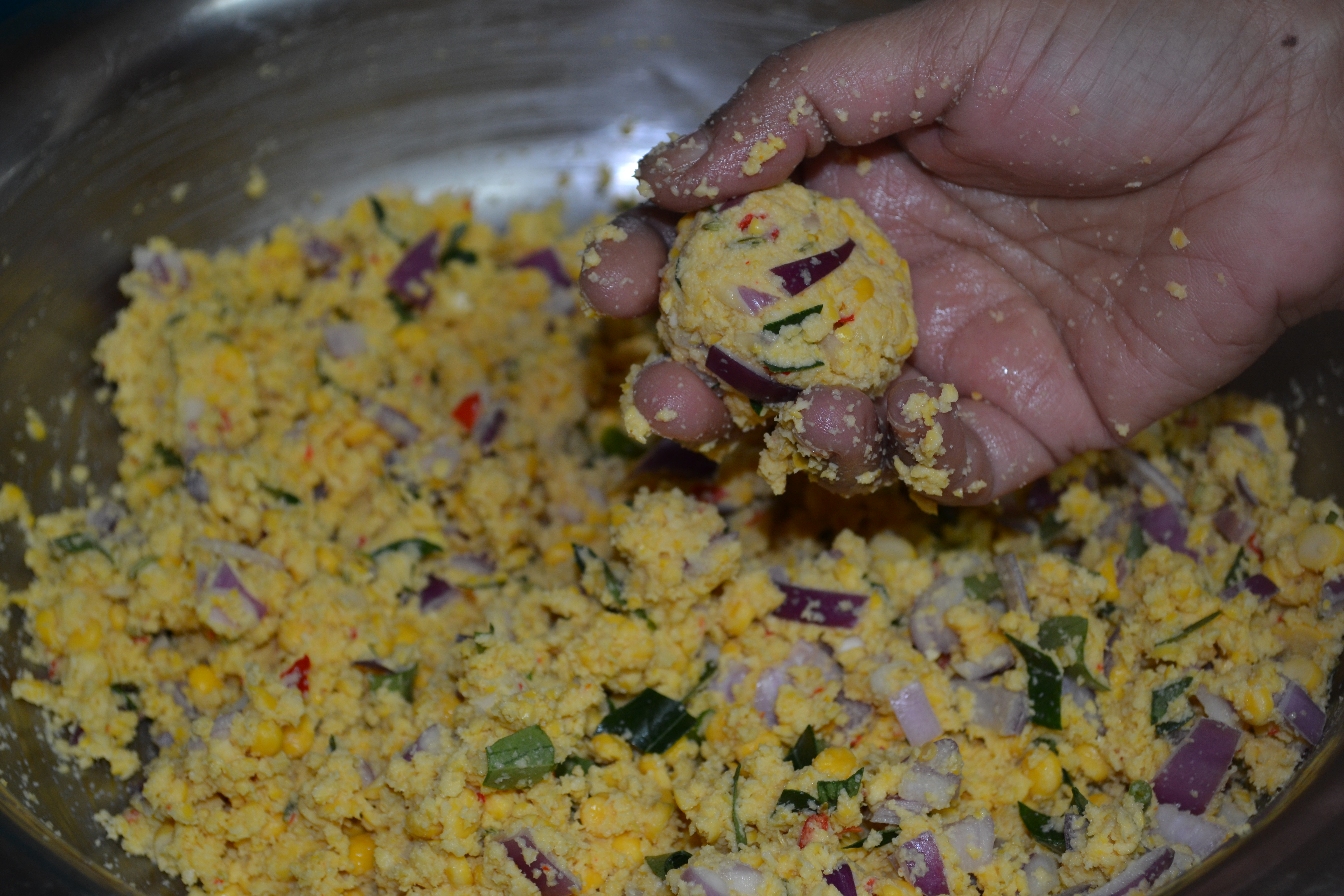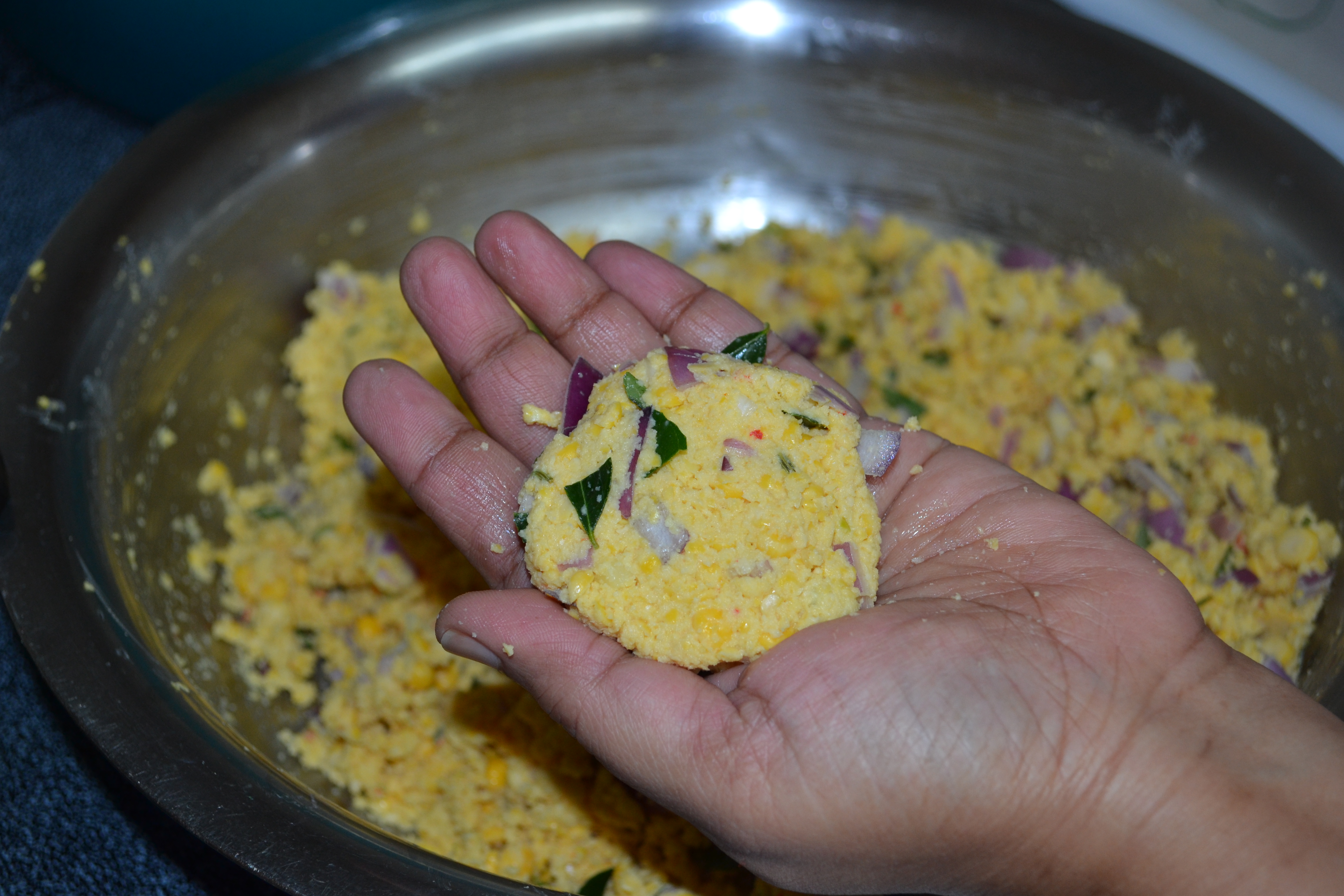- From the mixture take a handful and make a round, then press with the other hand to make it little flat