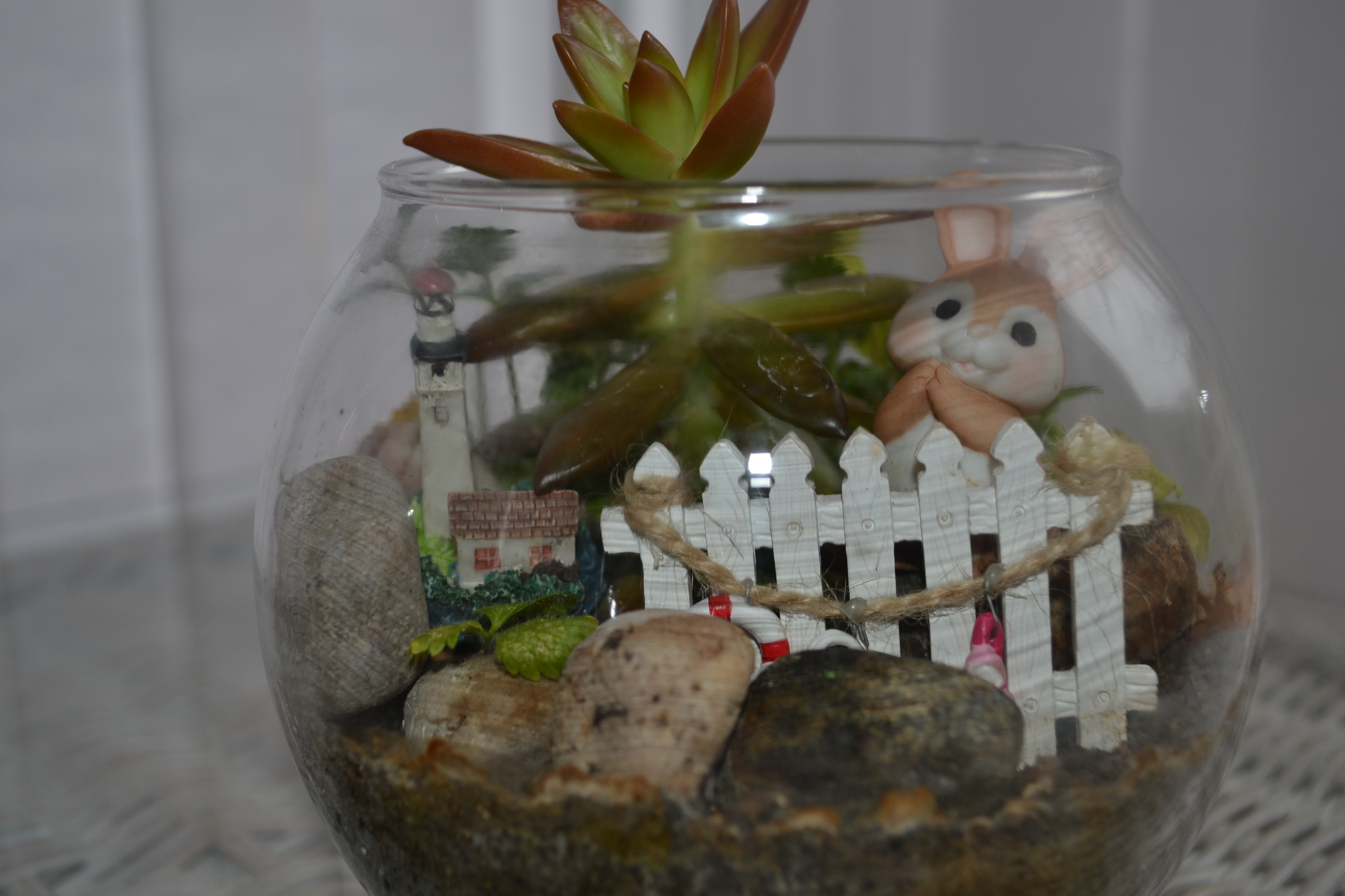 One of my favorite hobbies is creating fairy gardens. It is so much fun to watch a little plant environment grown in the mini world you’ve built. In summer I make an assorted variety of mini fairy gardens in my backyard, but since there are few more weeks before summer come in full blast, I will show you the terrariums that I create indoors.