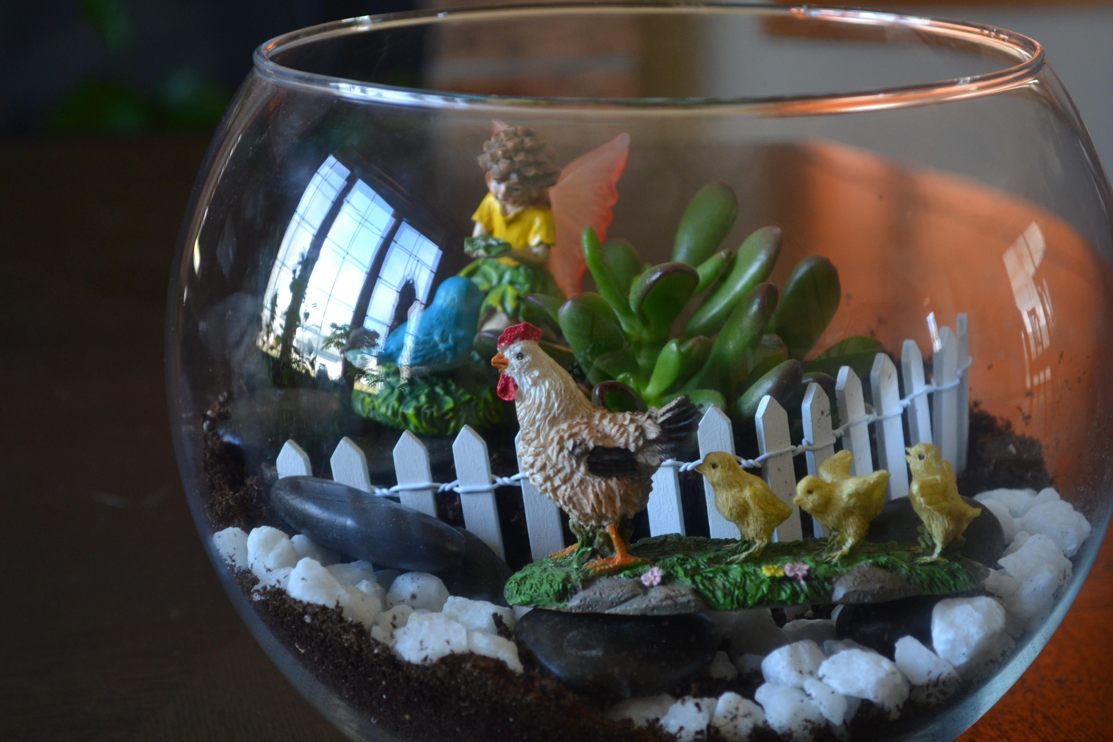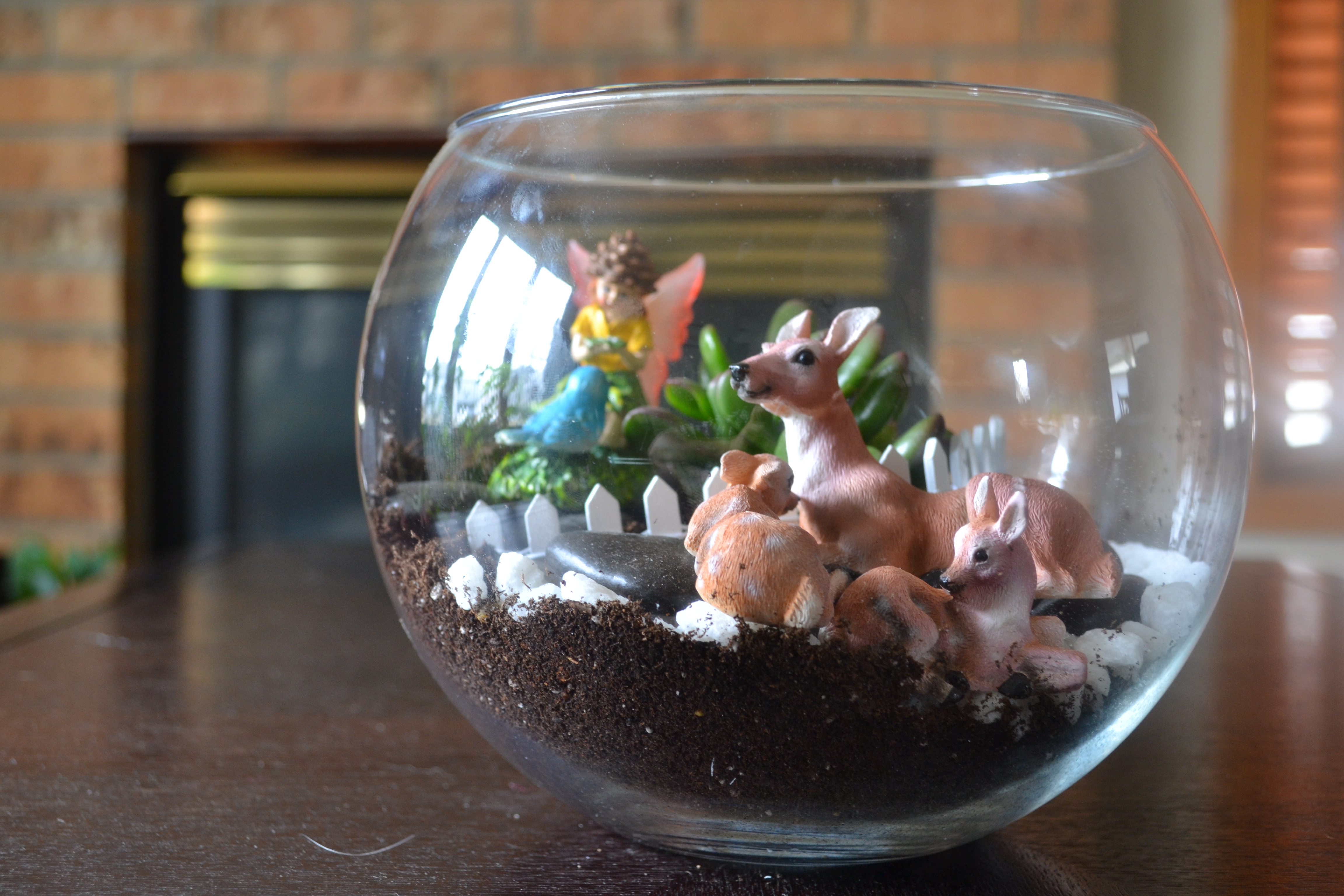 MAINTENANCE: The good thing about terrarium fairy gardens is that you can move them anywhere around the house depending on how much sunlight they need. Most gardens just need little bit sunlight (depending on the plant you use) and can just be watered once weekly. Since the plants have very little soil on the bottom, be careful to only put in a little bit of water (or even use a spray bottle instead) so the bowl doesn’t flood and give the plant root rot.
