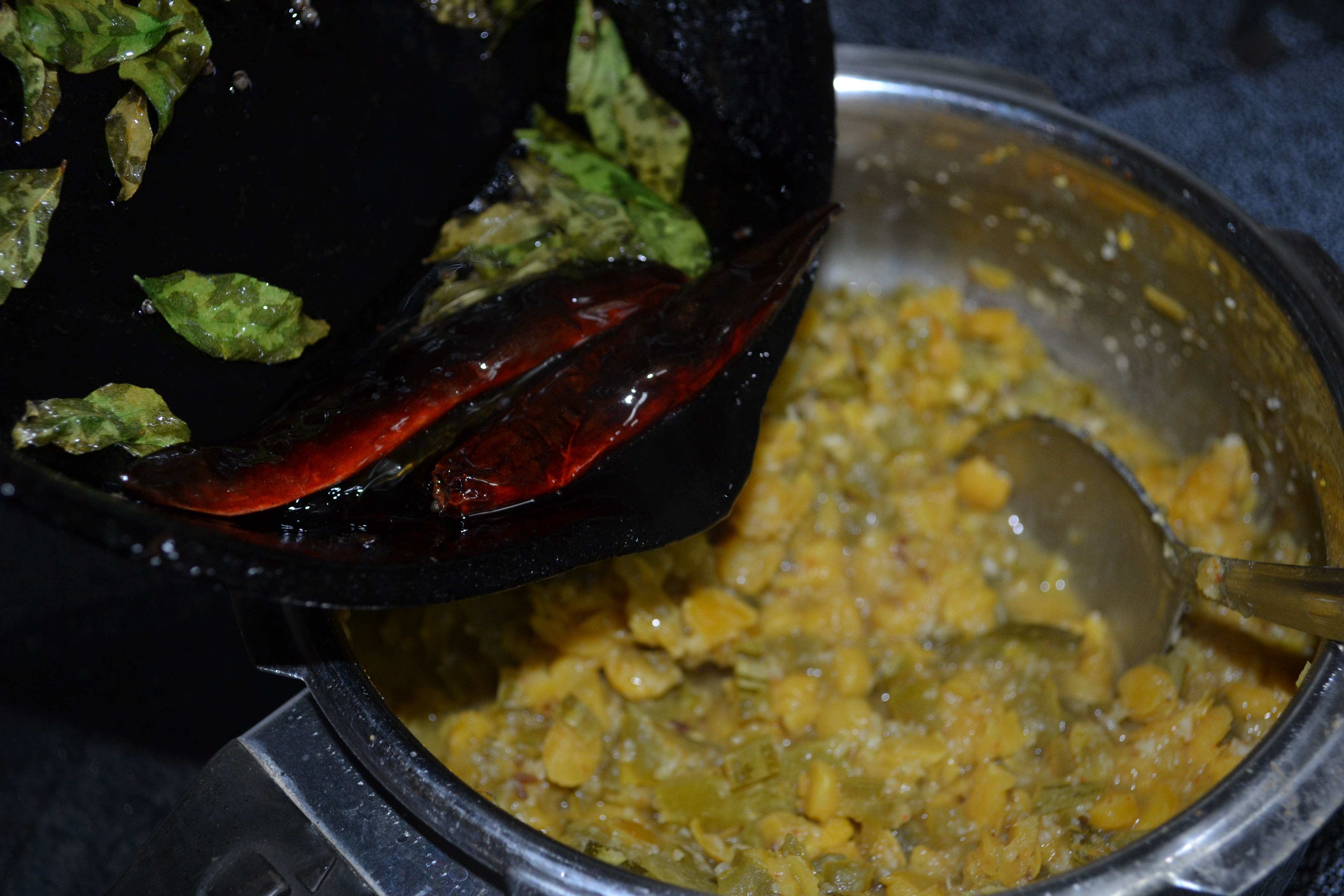 • In a pressure cooker add the diced snake guard, split chickpea dal, chili powder, turmeric powder, salt and 3/4 cup of water