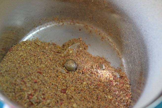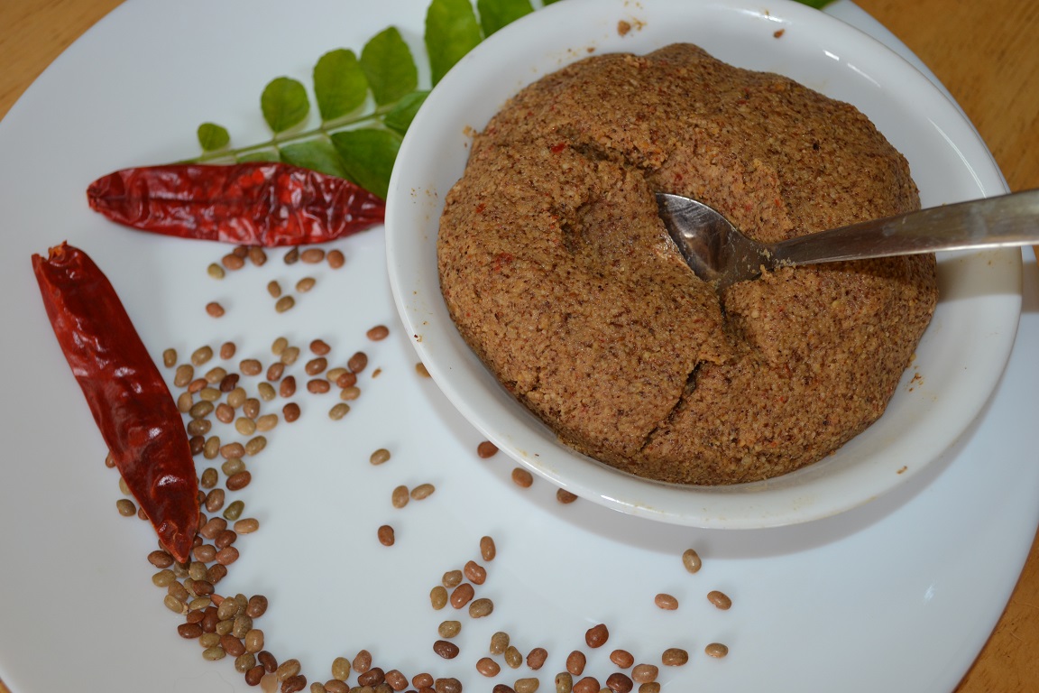 - Coarsely grind the roasted horse gram, chilies, garlic cloves, tamarind and salt using a mixer/blender.
