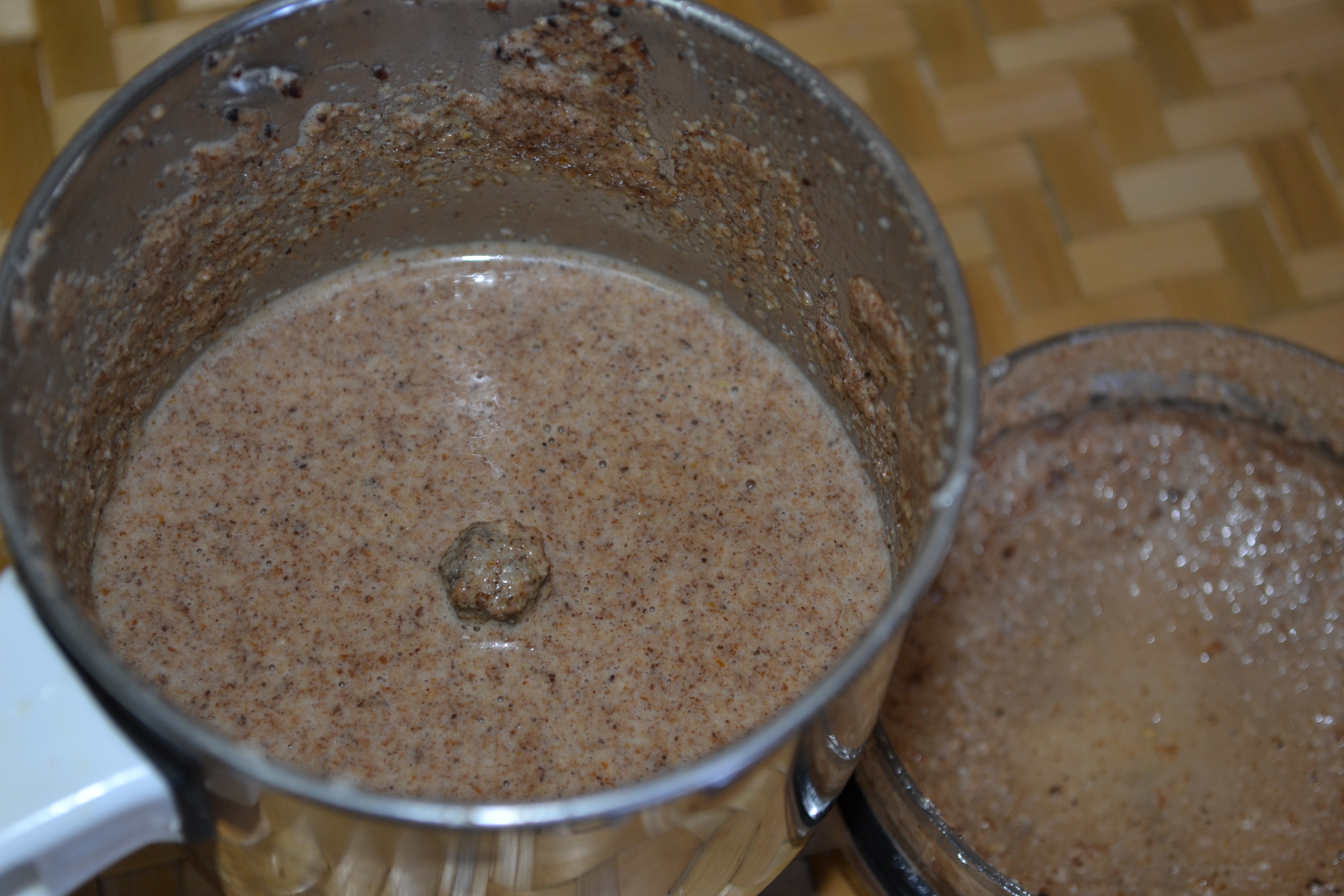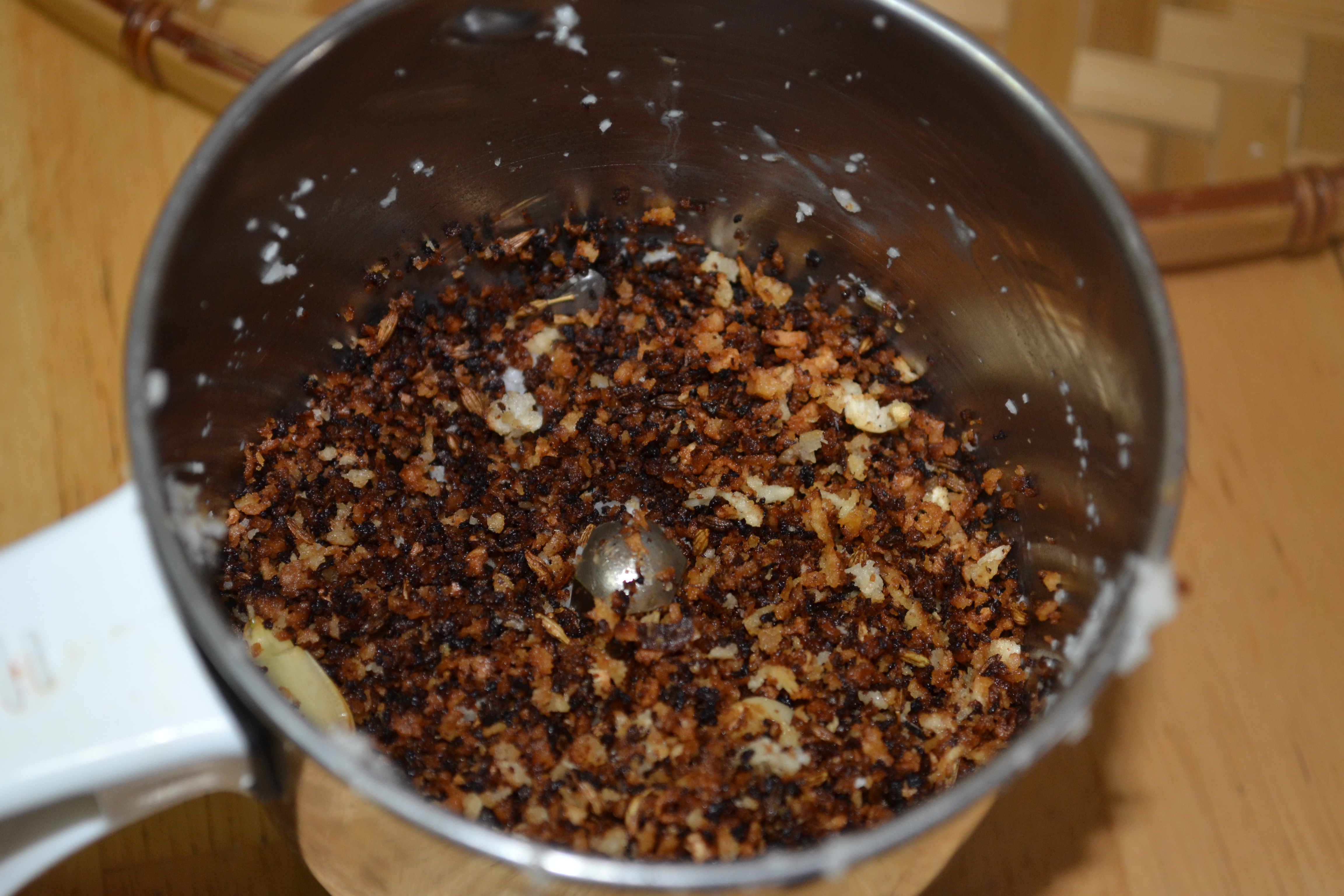 - Place a small pan on medium heat and dry roast the coconut until golden brown and grind this into a fine paste using a mixer/blender