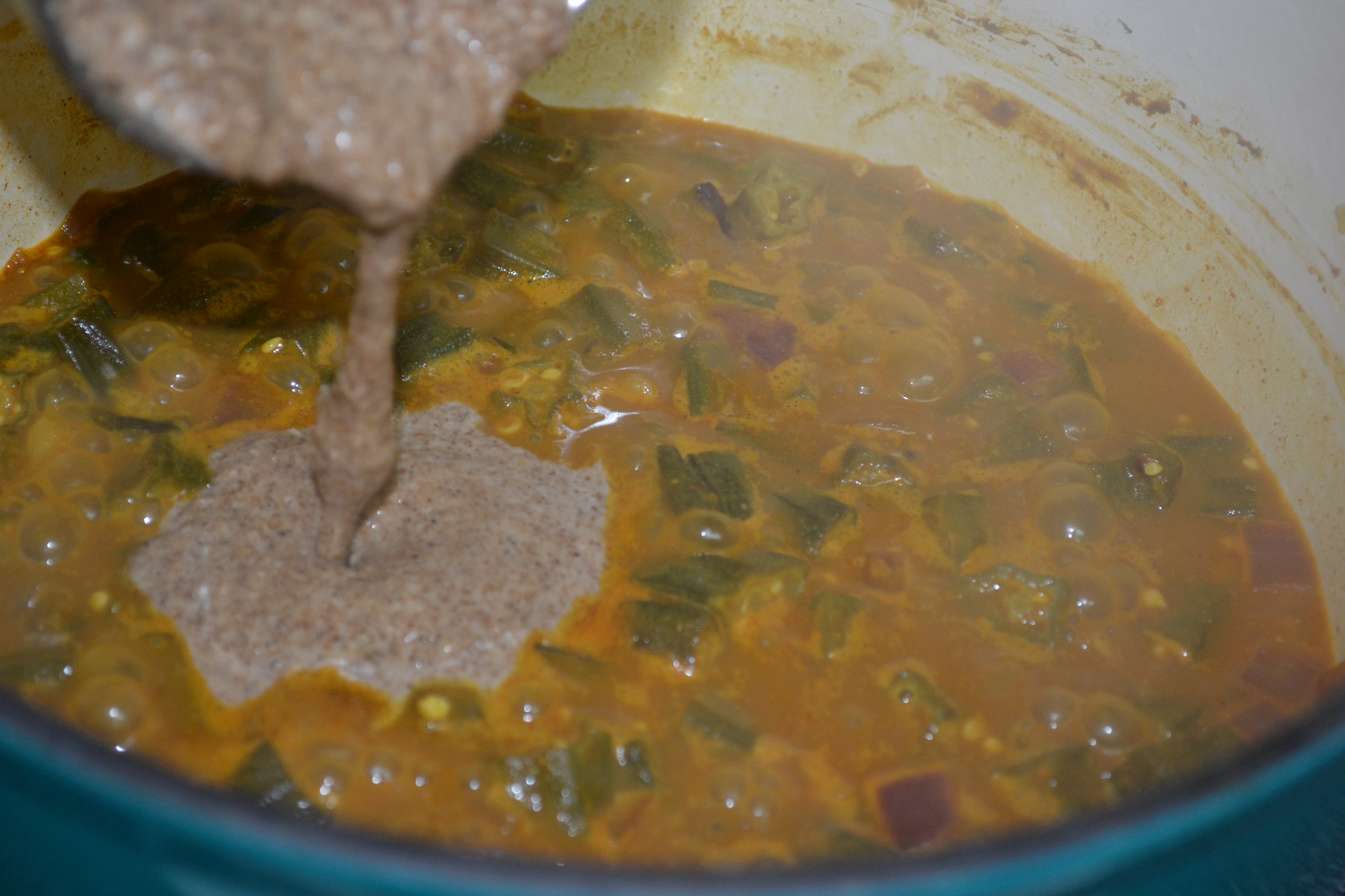 - Now add the coconut paste to the okra curry and mix it well