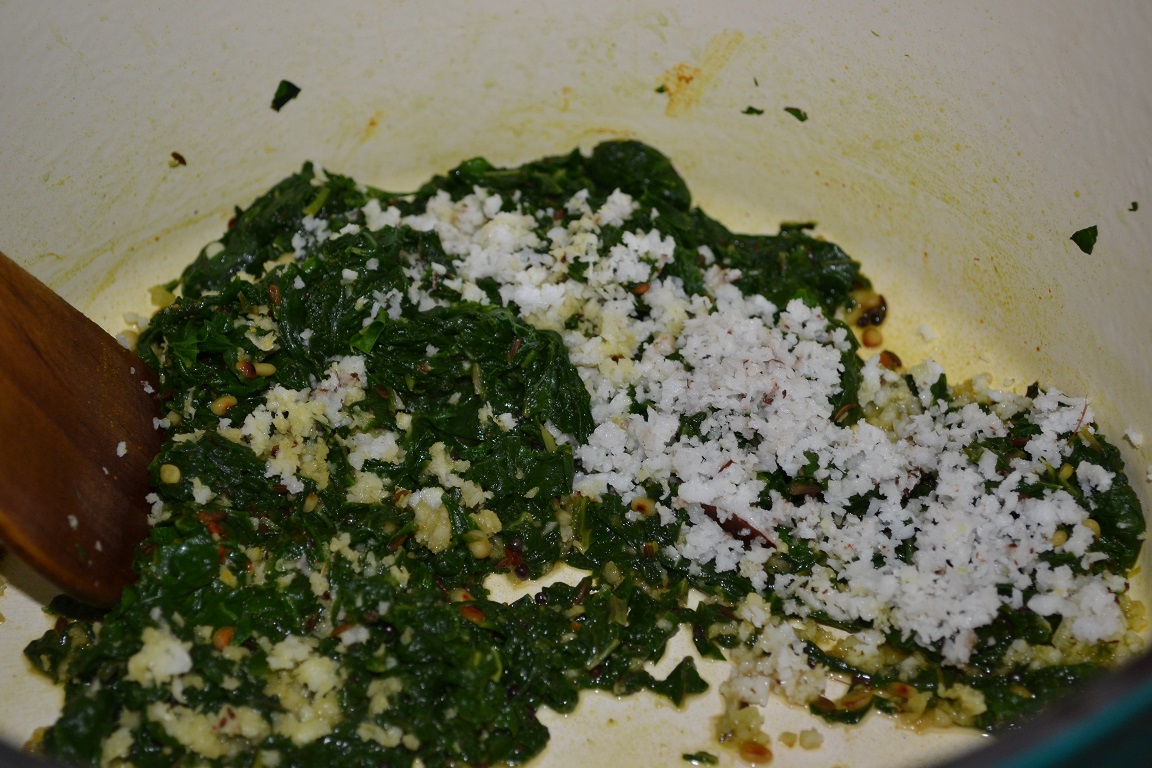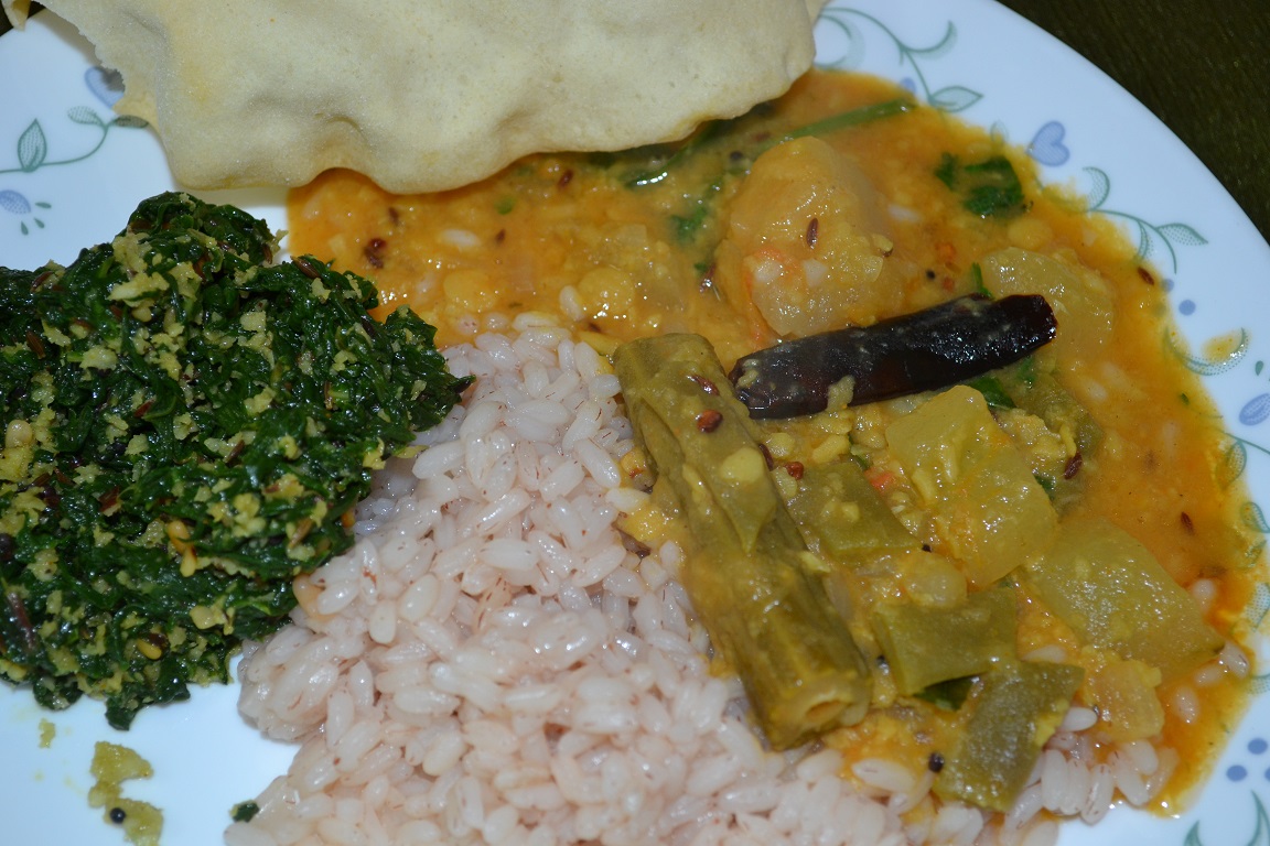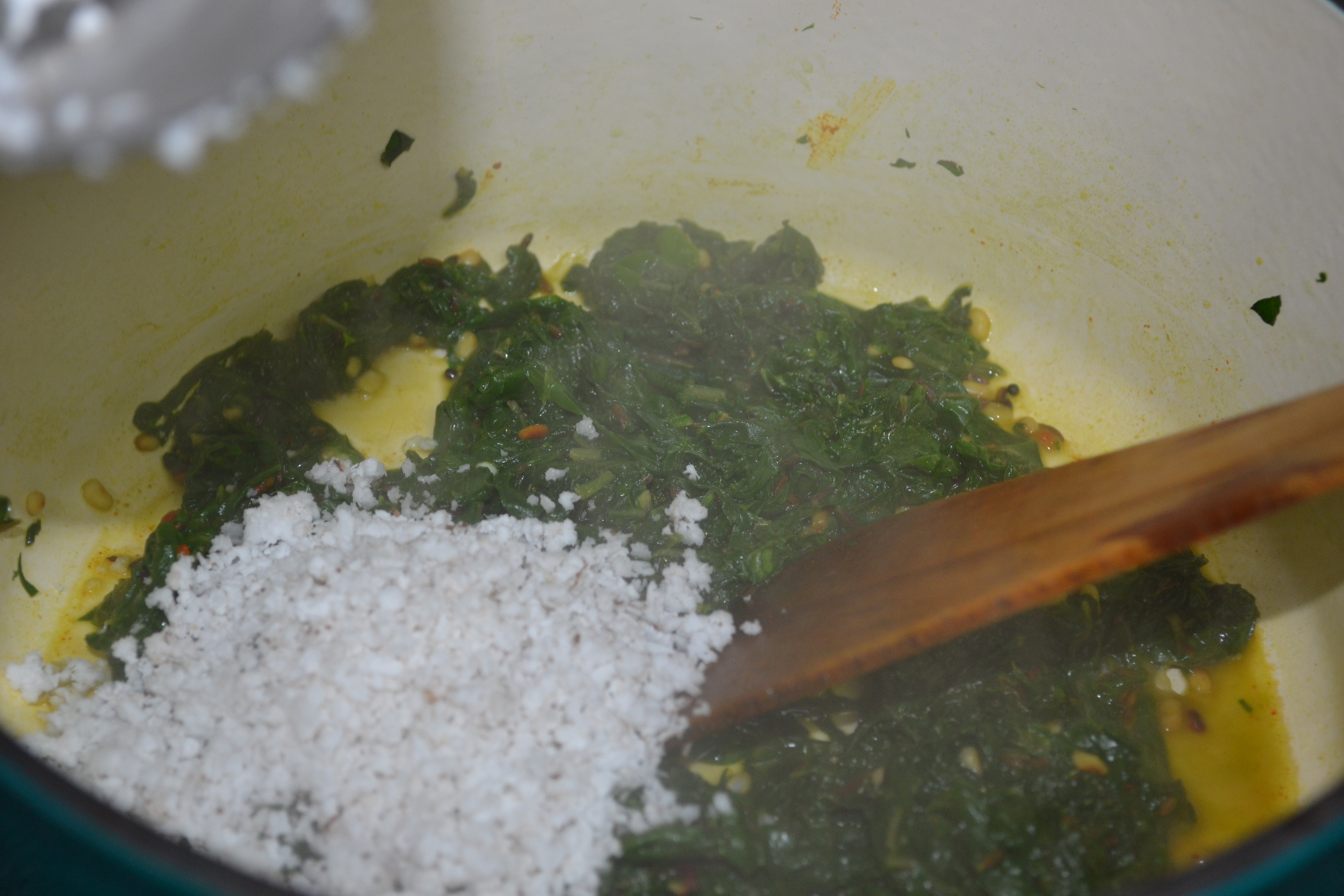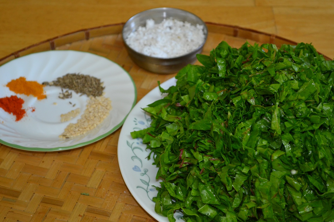 This is one of the tastiest spinach poriyals. A few years ago, one of my friends gave some mysterious seeds that I then sowed in our garden. I wasn’t sure what it would grow into, but it turned out to be a very healthy, green plant. I wasn’t sure what to do with it, or how to cook it, so I tried our hometown style of preparing spinach. It turned out so… good! Since then, for the past few years, we’ve always kept swiss chard in our garden. In markets, you can find it with red and yellowish white stalks..