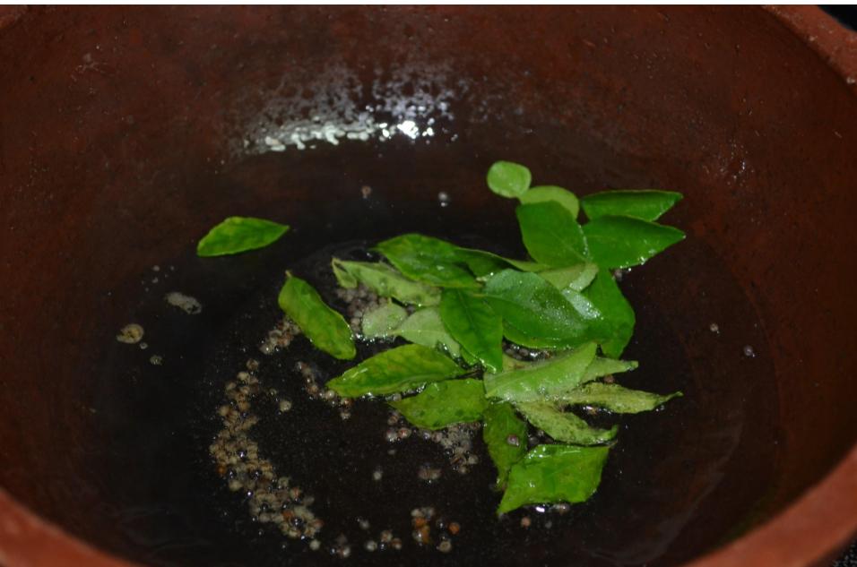 - After the mustard seed crackles, add the curry leaves