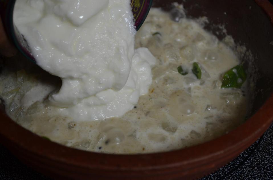 - Switch off the stove and add the yogurt and mix them well