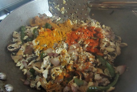 • Then add the mussels, chili powder, turmeric powder and coriander powder