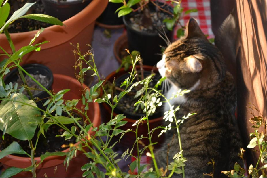 Our cat, Leo, also enjoys our plants,. Sometimes he sits inside the larger pots and searches for bugs, but for most of the winter months he sits inside the pot of my curry plant, which is level with the windowsill, and watches cars passing outside.
