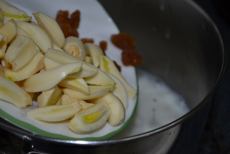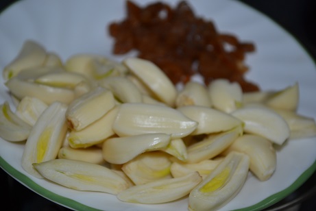 - Then add the garlic cloves and palm sugar crystals (panamkarkandu)