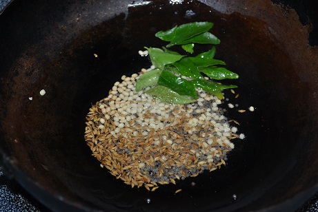 - Once it crackles, add the cumin seeds, urad dal and curry leaves