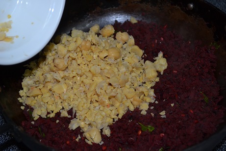 - Add the minced beets, chili powder, turmeric powder and salt to the pan