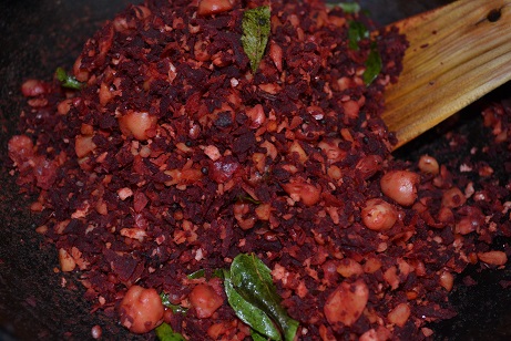 In our home, I often make beets poriyal, most of the time, I add different kinds of dals or peas into it, so it won’t be boring to eat often. This time I added some chickpeas in it, so you will get some protein too. It is a simple and tasty recipe.