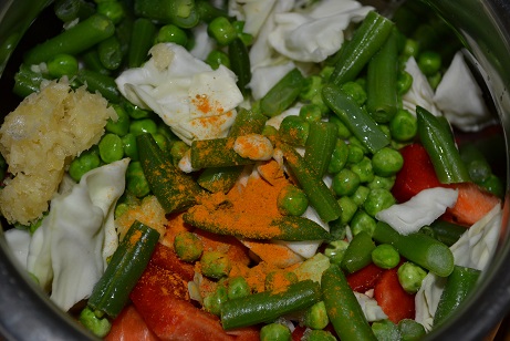 - In a pressure cooker add all the vegetables, little salt, turmeric powder and a cup of water