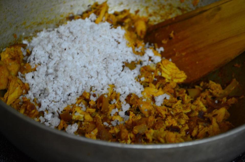 - After a minute add the grated coconut and stir it for couple of minutes