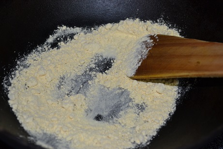 - Place a heavy bottom pan on medium heat and dry roast the besan flour for a minute