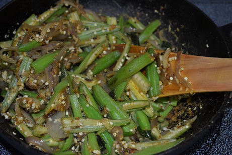 - Now add the roasted flour and stir until okras are coated with the flour (This helps removing the sliminess)