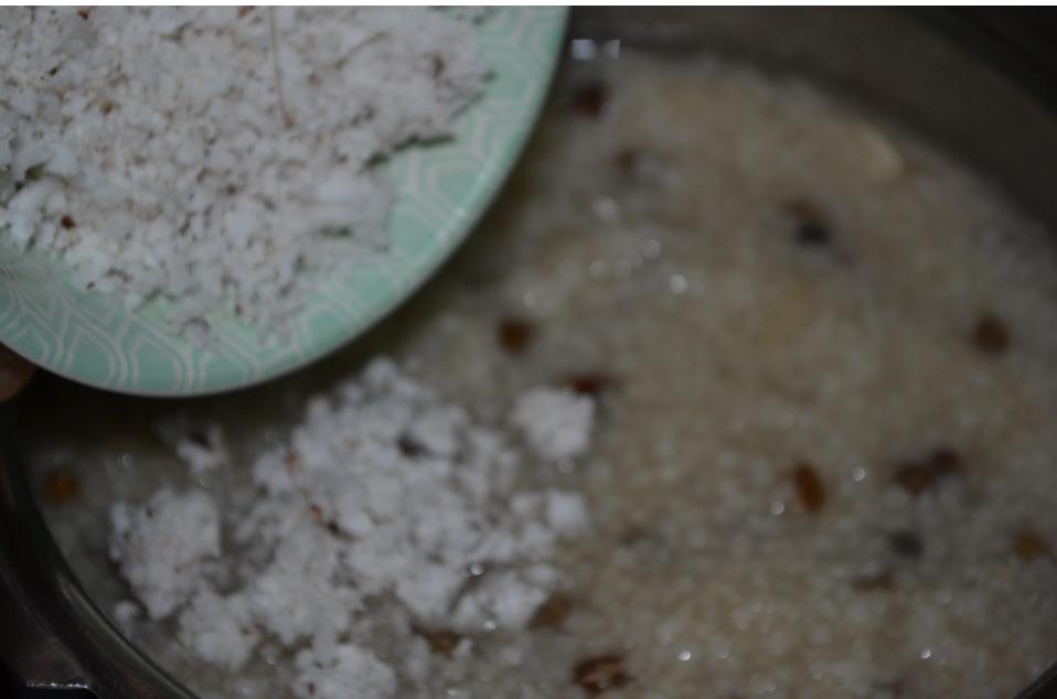 - Now open the pressure cooker, add the grated coconut and mix it well