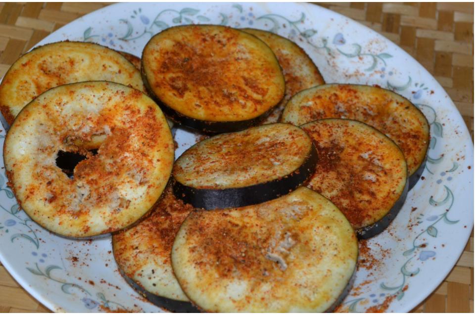 - Heat the oil in a wide pan in medium heat and place the marinated eggplant slices