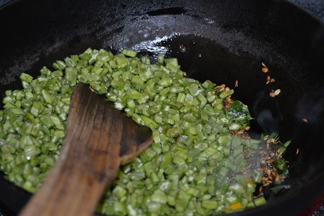 - Then add the finely cut cluster beans, a pinch of turmeric powder and little salt (paruppu usili already has salt, so add a little bit of salt for the cluster beans only)