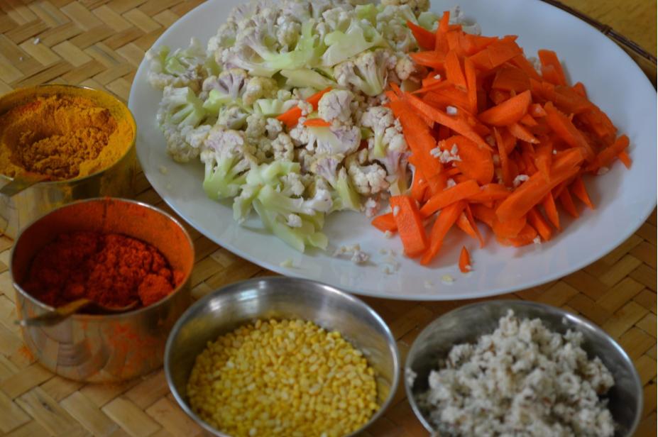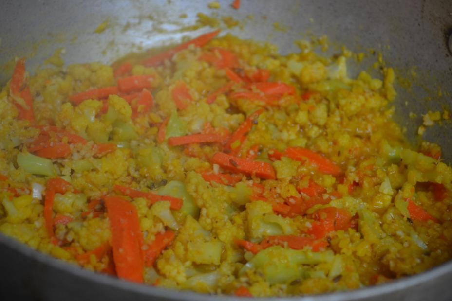 - Now add the cut cauliflower, carrot, chili powder and salt