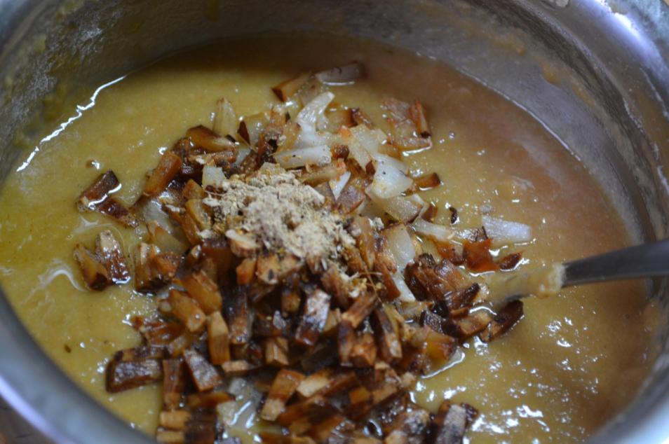 - Then add the roasted coconut pieces, the ginger and cardamom powders and mix them well