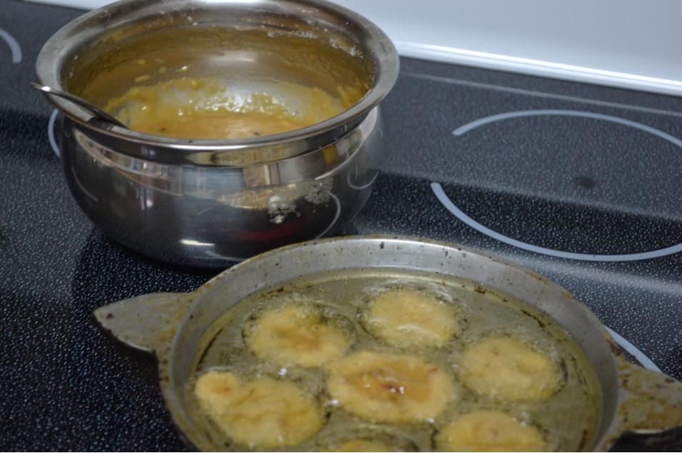 - Now pour a tablespoon of batter in each deep spot of the pan