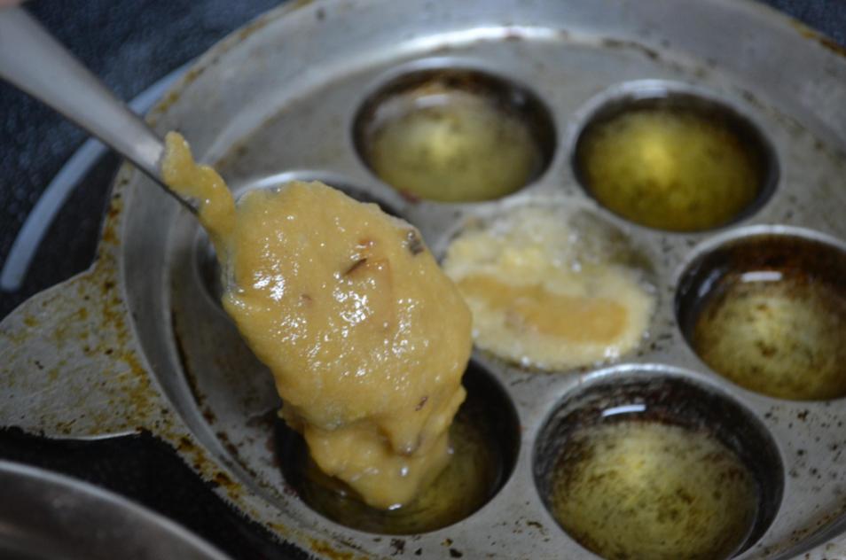 - Now place the kuzhi paniyaram pan, also called as unniyappam pan on the stove and add oil