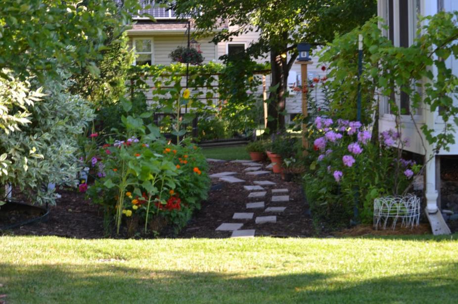 The sides of the pathway are filled with a garden of native flowers. The bees love this part of my yard! The sunflowers all came from birdfeed that the squirrels knocked over. We almost plucked them all out like weeds, but since we didn’t want to get rid of them entirely, we moved them to nicer places around the garden.