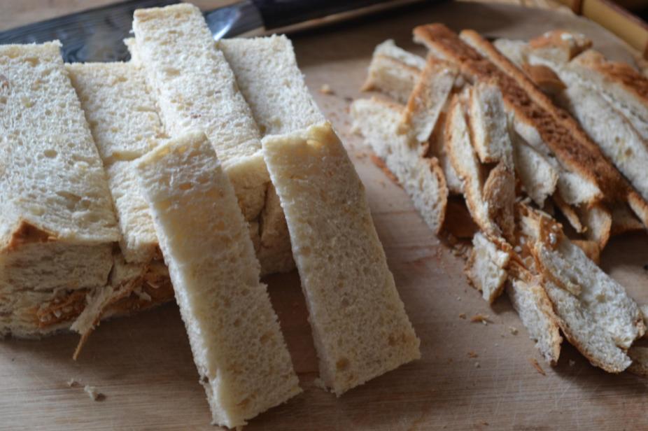 - Trim the brown edges of the bread slices and cut them into long pieces