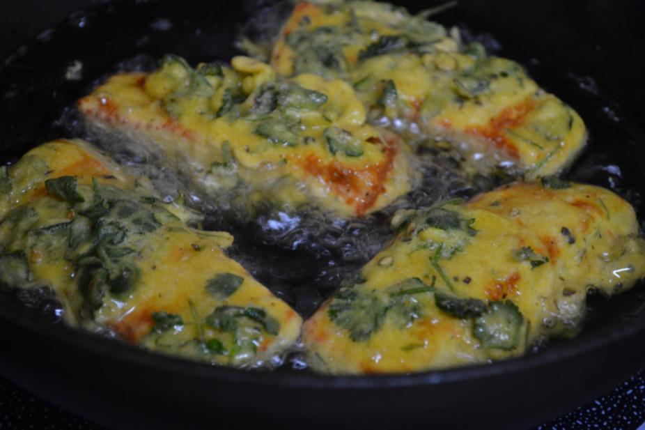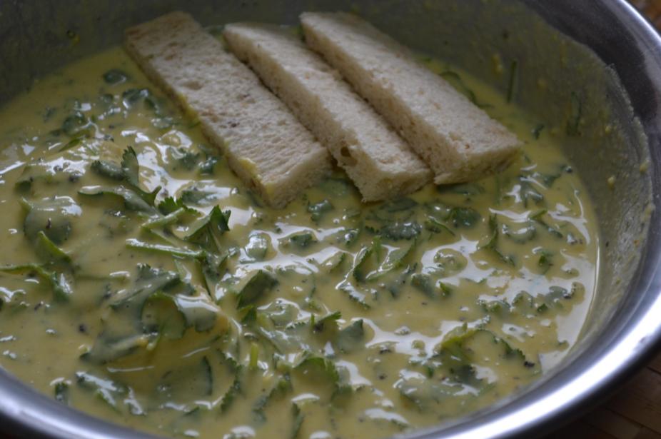 - Now take few pieces of bread at a time, dip them into the batter and fry them in the oil