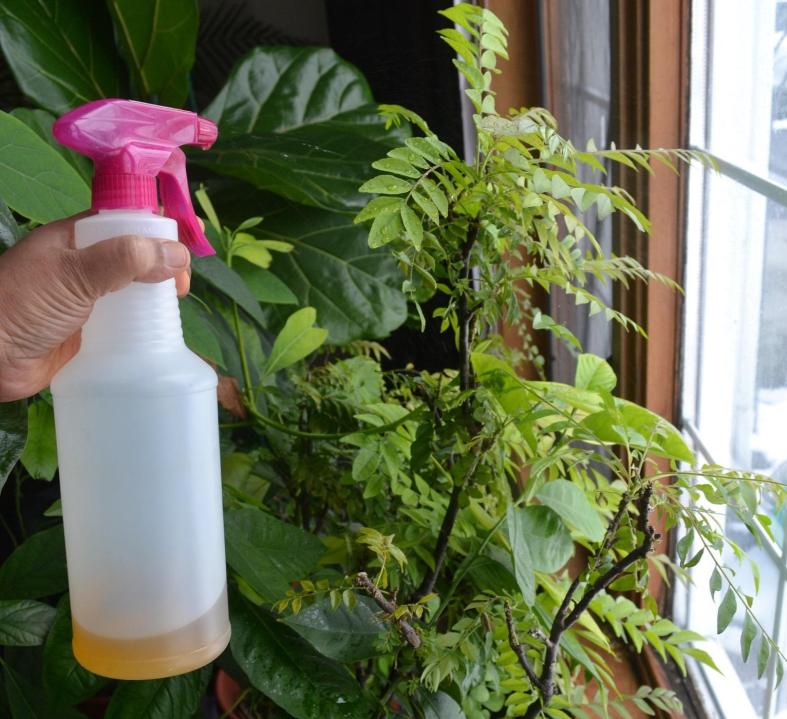 - For our indoor plants, I mix 2 or 3 cubes of frozen pesticide in 100ml of water and add few drops of liquid dish soap, and few drops of cooking oil and shake it well and spray on the plants