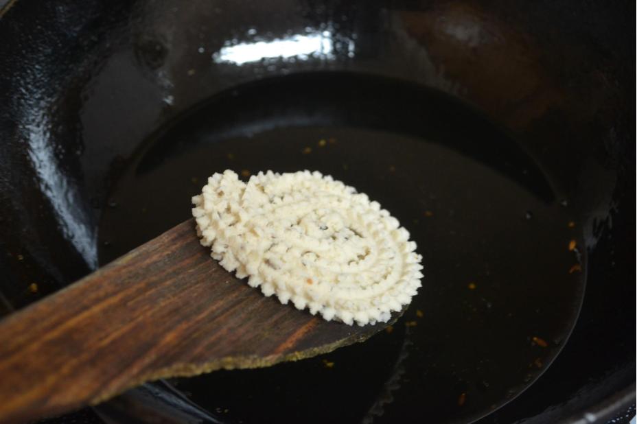 - Carefully drop the murukku into the oil by hand or using a spatula