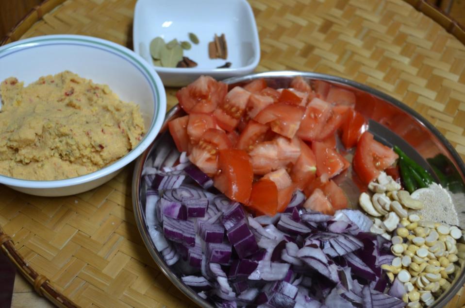 - Now heat another pan with a table spoon of oil and add all the ingredients listed to make a paste