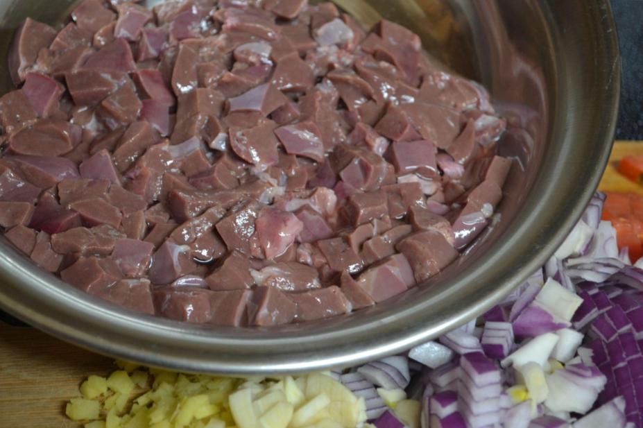 - Then add the diced liver, chili powder, turmeric powder, garam masala, coriander powder and salt