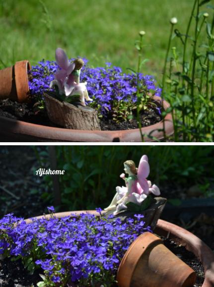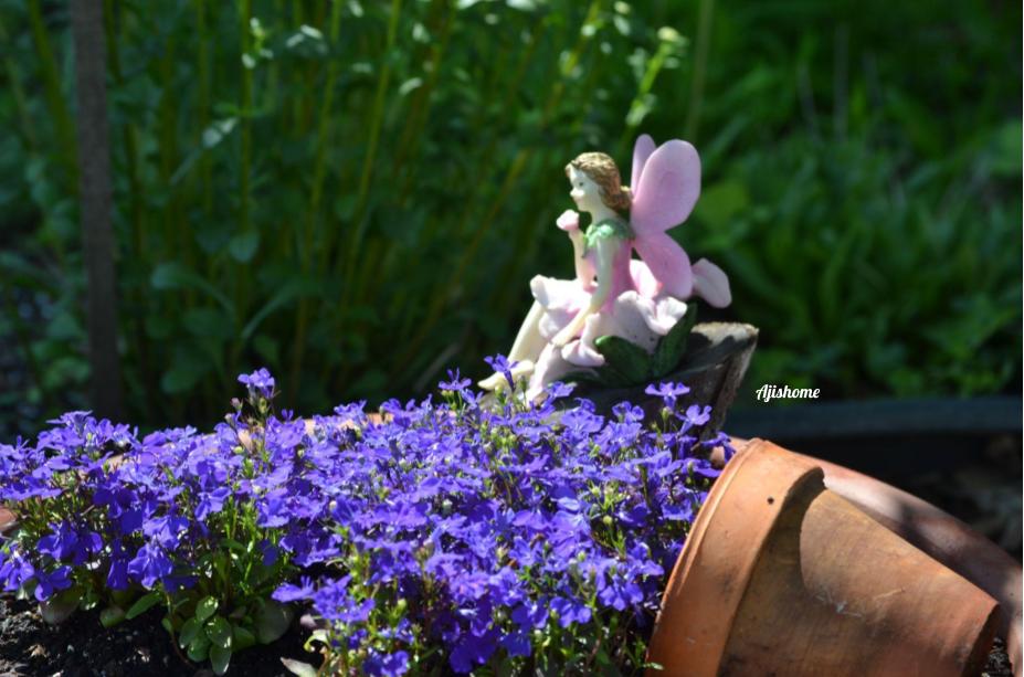 Small flowers are more suitable for this kind of spilled flower pot. I added lobelia plants, since their flowers are so cute and bright. Tiny varieties of petunia are also a great choice for this kind of spilled flower pot. You can add as many little details as you would like to this creation. I added a little fairy in it at the end, and it looks so beautiful.