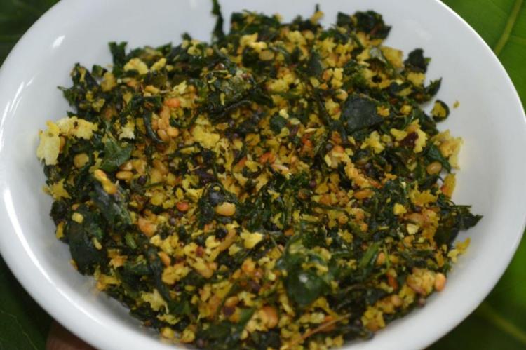 - The dish in the above picture is, rice served with lamb’s quarter stir fry, papaya poriyal, breadfruit kootu and anchovy fish kulampu