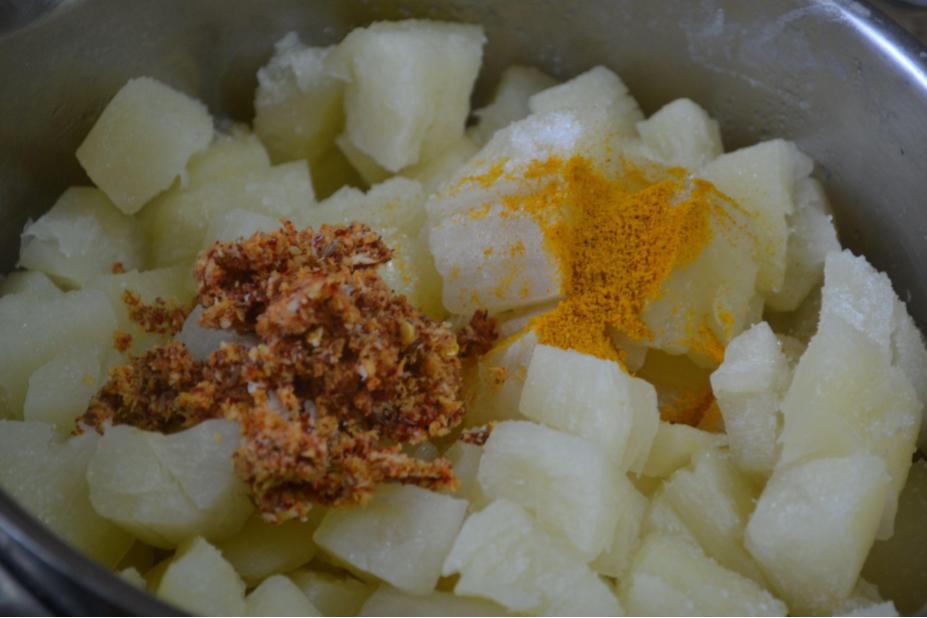 - Add the ground paste, turmeric powder and salt into the cooked tapioca