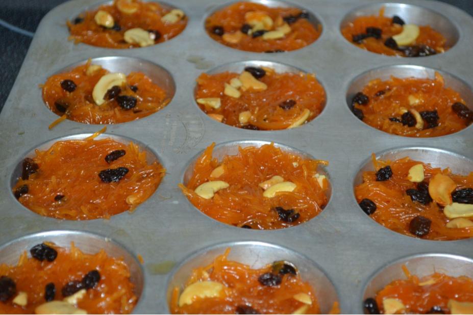 - Once the kesari is ready, I fill it in muffin cups (before filling, lightly grease the muffin cups with ghee.)
