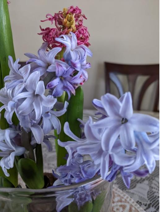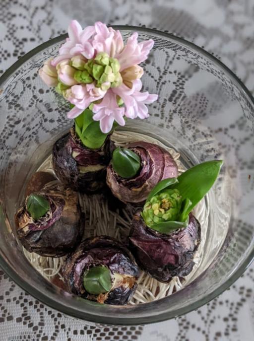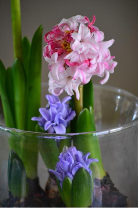 This is the first time I tried to grow some spring flower bulbs indoors, like tulips and hyacinth and I am very pleased with the results. The hyacinth bulbs did well in the water and bloomed nicely. I bought the bulbs from a garden store and kept it outside for a month, then first week of November I took a vase and I just added small rocks from the garden. Before adding the rocks, I washed the rocks. I then added the hyacinth bulbs and then added the water up till the bottom of the hyacinth bulbs. After a week it started to root, and after few weeks it started to bloom. I planted five hyacinth bulbs, out of those five, the first and second bloomed pink and the rest came out purple. Our living room filled with the great fragrance of hyacinth. It started to bloom in December still in the middle of February I have the bloom, so I am planning to do next year also! I hope you try this next winter.