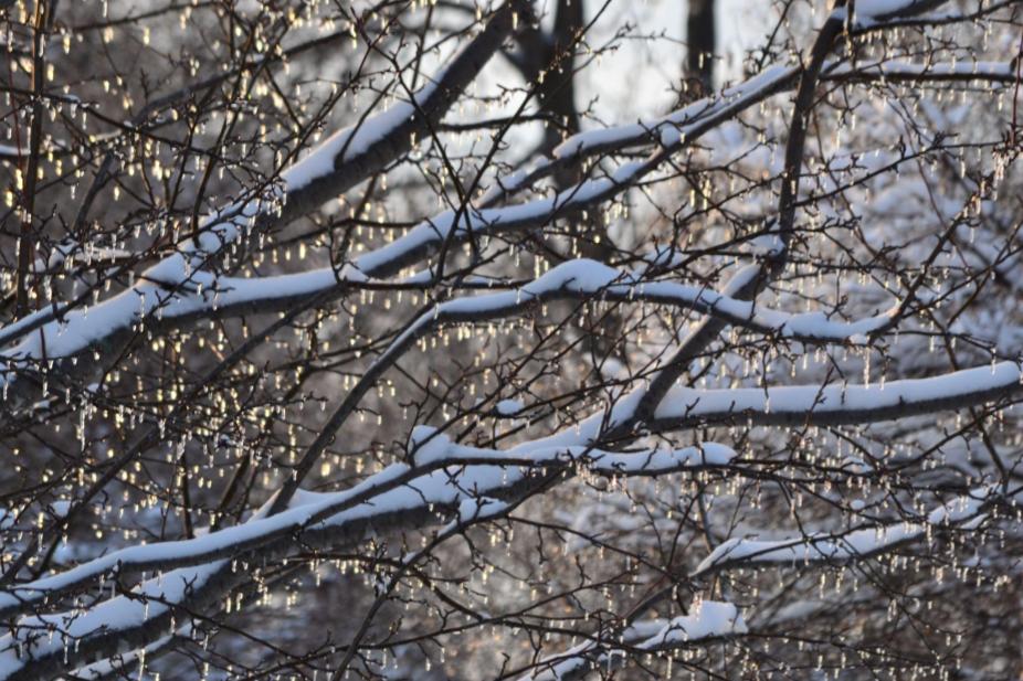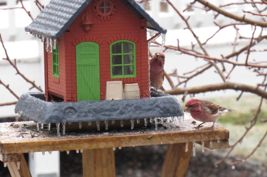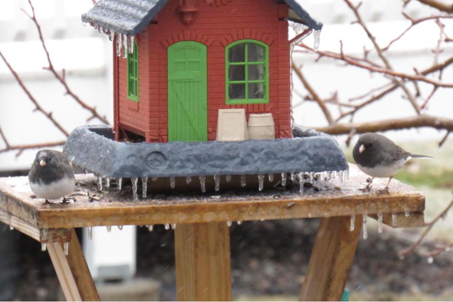 Today is a cloudy day, but when I looked outside it was so beautiful with icicles (Icicle is a spike of ice when water falling from an object freezes.) everywhere. The birds were sitting quietly on the tree branches. Here are some pictures taken today and some from last week, with the icicles around the backyard trees and birdfeeders.