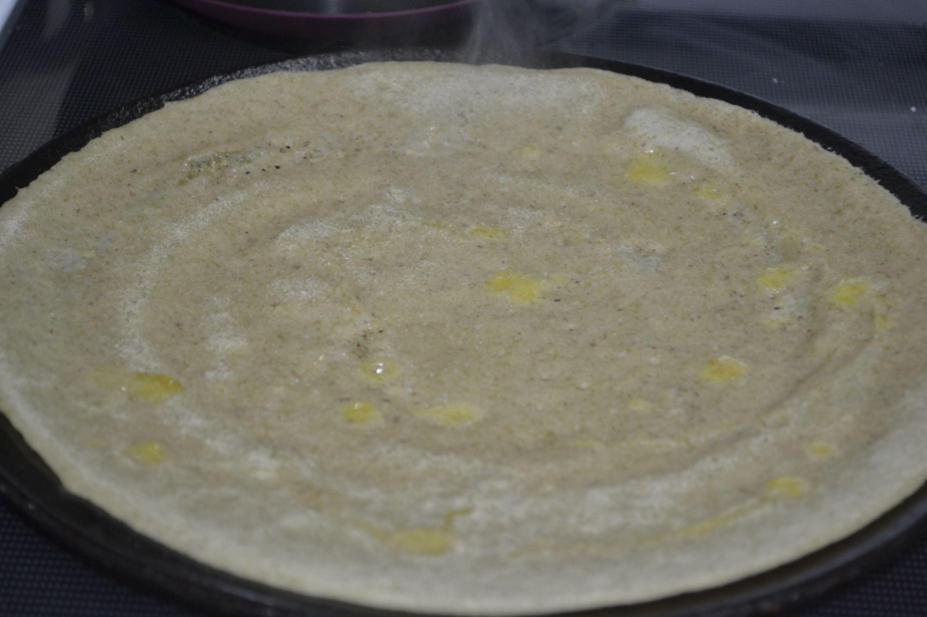 - Once the pan is hot, pour one full ladle of batter and spread it evenly in circular shape