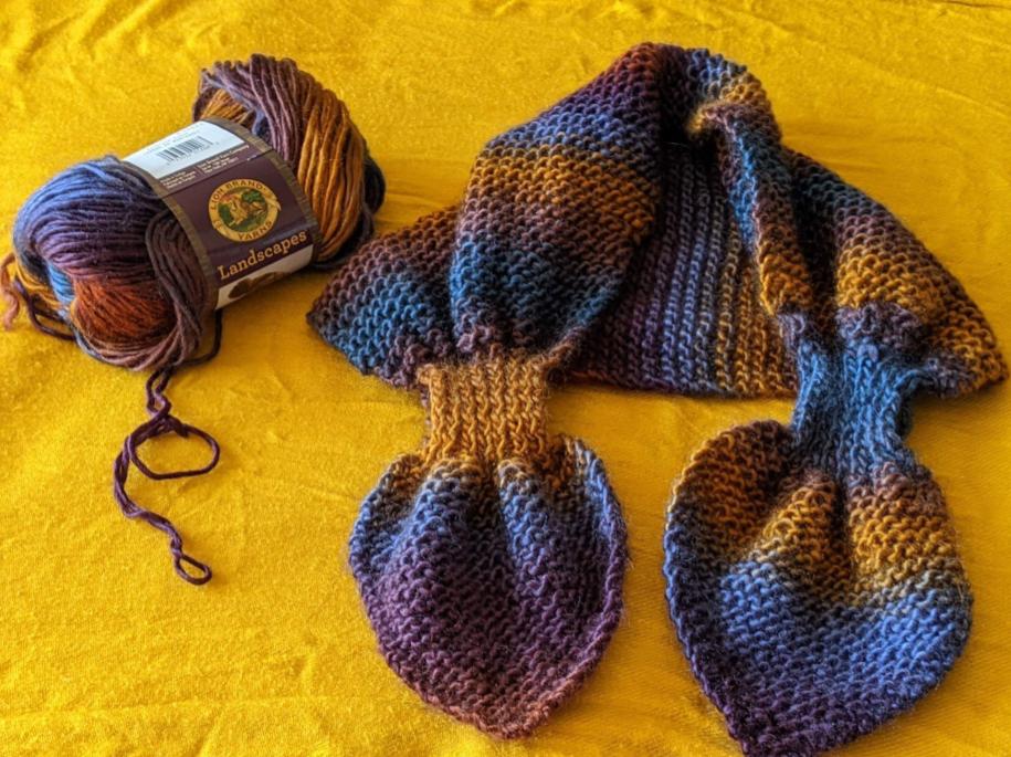 From two skeins of yarn, I used one full skein and may be a quarter skein from the other. I used the lion brand landscapes yarn to make this scarf using US 10 knitting needles.